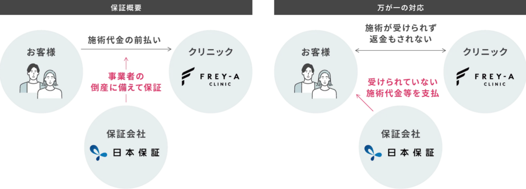 この保証サービスは2025年8月1日以降に「フレイアクリニック」「フレイアクリニックメンズ」にてご契約いただいたすべての患者様に自動的に適用されます。なお、本保証サービスは、患者様に安心してご利用いただくための備えとして設けた仕組みです。